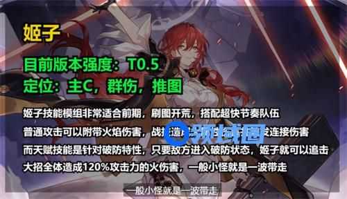 目前版本强度T0.5,定位主C、群伤、推图,技能模组非常适合前期刷图开荒,搭配超快节奏队伍,普通攻击可以附带火焰伤害,战技造成火属性伤害并触发连接伤害,而天赋技能是针对破防特性,只要敌方进入破防状态,姬子就可以追击,大招全体造成120%攻击力的火伤害,一般小怪就是一波带走。