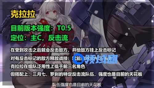 目前版本强度T0.5,定位主c,反击流,在受到攻击之后就会反击敌方并给敌方挂上反击标记,对有反击标记的敌方释放战技,就能造成超高的伤害。克拉拉在组队泛用性上低于前三名角色,但搭配上三月、七罗刹的特定反击流,队伍强度也是目前的天花板。