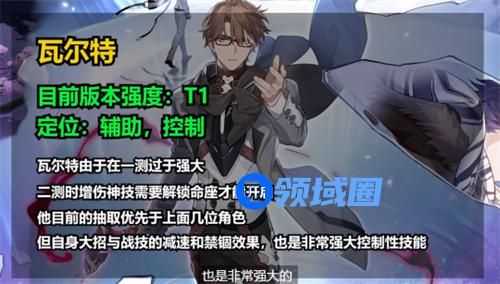 目前版本强度T1,定位辅助、控制,瓦尔特由于在一测过于强大,二测时增伤神技需要解锁命做才能开启,他目前的抽取优先度略低于上面几位角色,但自身大招与战技的减速和进步效果也是非常强大的控制型技能。