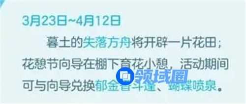 花憩节将会在2023年的3月23日——4月12日,活动将会持续20天。活动期间3月23日~4月12日暮土的失落方舟将开辟- 片花田;花憩节向导在棚下育花小憩,活动期间可与向导兑换郁金香斗篷、蝴蝶喷泉。