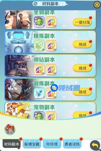 天天驯兽师的副本分为四大类,分别是材料副本、秘境宝藏、玲珑塔、勇者试炼。