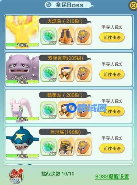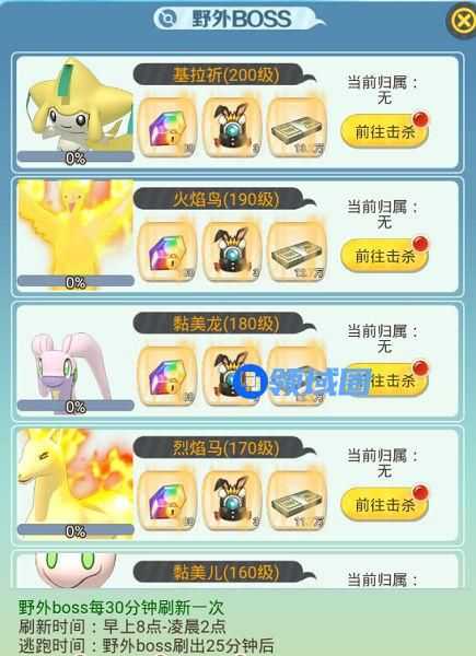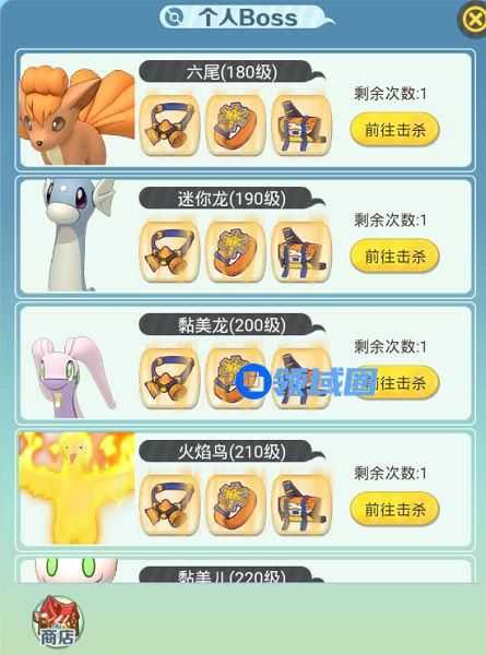 第二页是野外boss,在规定的时间内挑战boss,成功将会获得钻石、装备及宝可元,失败boss将会逃跑,每次挑战需要花费挑战证明书。