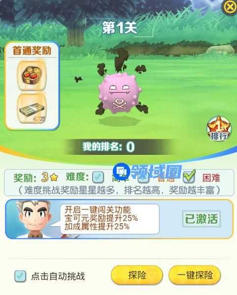 第五页是探险之旅,共3种难度,只有成功通关,才能挑战下一难度,每一关都有大量的进阶果实和宝可元。