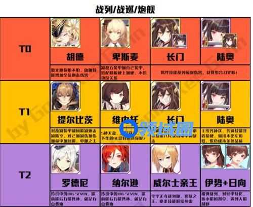 T0:胡德,俾斯麦,长门,陆奥(长门,陆奥同时上阵触发羁绊才能是T0)