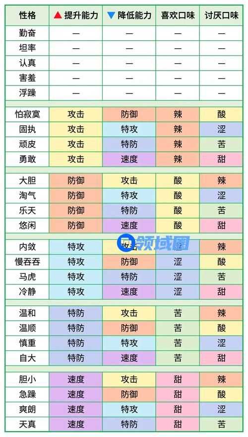 总之以上就是游戏当中的全部性格对照表了,其中性格能改变的属性只有物攻、特攻、物防、特防和速度,HP并不能用性格改变。性格增加属性是将属性变为原来的1.1倍,减少是将属性变为原来的0.9倍。