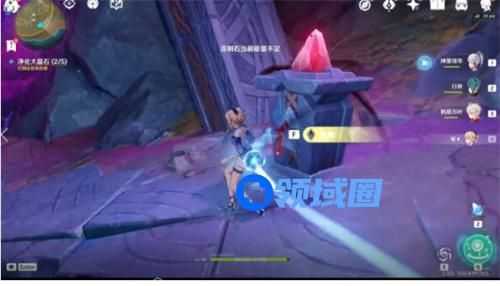5、净化大晶石:观察这个大晶石上缠绕的黑气源头方向,就是需要净化的机关位置。(这里高处有几个地方的黑泥涌口是二阶的,流明石触媒等级如果不够的话不能完全清除它的,不过也不影响给机关充能,站在附近用流明石触媒的光照到机关就行。)