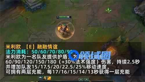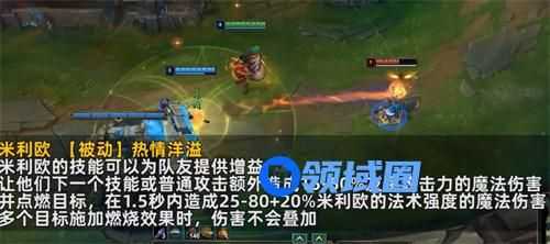 米利欧的技能可以为队友提供增益让他们下一个技能或普通攻击额外造成15-50%友军攻击力的魔法伤害并点燃目标,在1. 5秒内造成25-80+ 20%米利欧的法术强度的魔法伤害多个目标施加燃烧效果时,伤害不会叠加。