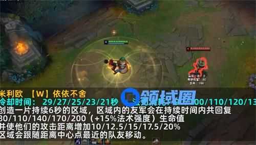 创造一片持续6秒的区域,区域内的友军会在持续时间内共回复80/ 110/140/ 170/200 (+15%法术强度)生命值井使他们的攻击距离增加10/ 12.5/ 15/17.5/20%,区域会跟随距离中心点最近的队友移动。