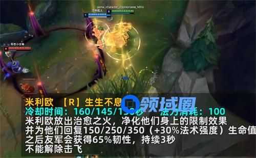 米利欧放出治愈之火,净化他们身上的限制效果井为他们回复150/250/350 ( +30%法术强度)生命值之后友军会获得65%韧性,持续3秒不能解除击飞。