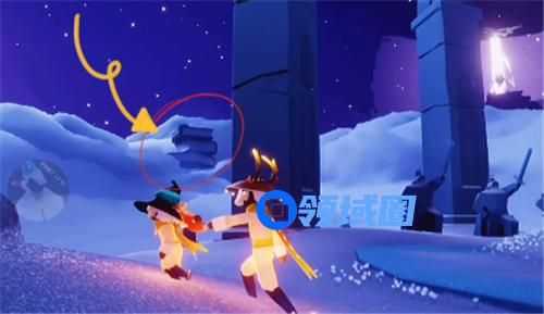 第二个先祖(舒展点灯人)在这个像灯塔的建筑里,落到平台后就能看到。
