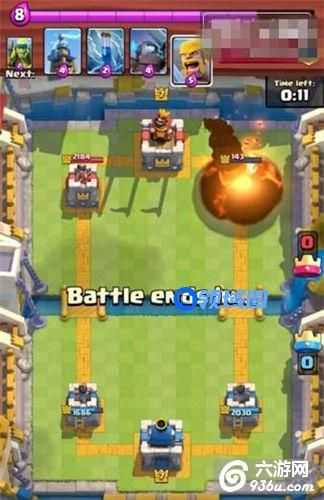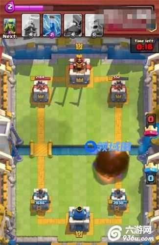 下了地狱塔、墓碑之后,对方一直没有发动进攻,我方满费时手里是箭雨、黄毛、大火箭、炸弹人,下一张牌是弩。所以我们塔后下炸弹人过牌+攒费,手里拿到连弩后的下一张牌是恶魔海。这时我们心里要清楚,又攒齐一套,如果对方用费下电塔或火球砸我们的话,那么这是一个非常好的进攻时机,因为我们还有个炸弹人。这时因为我们场上的地狱塔和墓碑,对面果然没有进攻而是贴河道下了个电塔,同时又用火球砸掉我们的地狱塔和墓碑。等手里9费半时,果断下连弩+恶魔海。