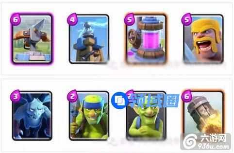 XB、一个防御塔(特斯拉电磁塔,加农炮,地狱之塔)、圣水采集器、野蛮人、万箭齐发/火球、亡灵、哥布林投矛手、哥布林、以及最多1-2个可以独立进攻的卡(火箭、雷电法术居多)。