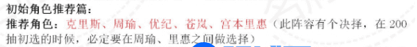 初始角色推荐:克里斯、周瑜、优纪、苍岚、宫本里惠