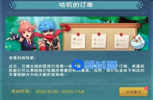 20级以上的探险家可以在“活动”界面,点击“咕叽的订单”页签参与活动,进入订单活动面板后可以看到咕叽准备好的订单列表,上方有需要各位帮忙收集的物品,作为回报给大家的奖励积分及道具等