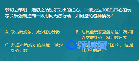 梦幻之黎明,魅惑之哈妮尔丢出的红心,计数到达100后带心的玩家会被强制控制一段时间无法行动,如何避免这种情况?这是DNF阿拉德智慧星9月25日题目,下面游戏宝小编为您带来正确答案。