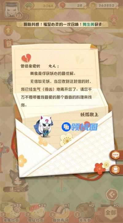 玩家将收到一封由式神留下的信。虽然有人说他们离家出走,大发脾气,但信中也非常明确地说,只要他们带上自己最喜欢的食物来喂养,就可以把离家出走的式神带回来。