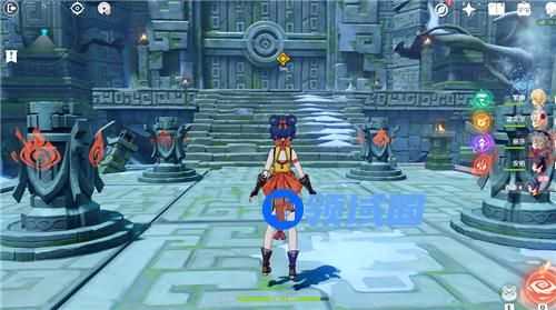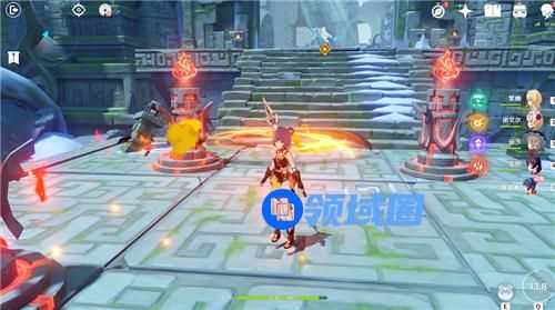 首先这个大门前面有四个火元素机关,想要打开大门,必须【用火元素同时攻击这四个机关】。目前所有的火元素角色中,只有香菱的大招才能实现,【在四个机关中间开启大招】会出现一个火环,瞬间点燃四个机关。