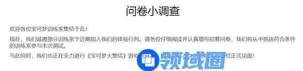 根据调查问卷中的信息,调查玩家对宝可梦系列作品的熟悉程度和喜爱程度,以及玩家对“宝可梦大集合”的看法。由于问卷调查的目的是寻找参加测试的玩家,因此也会提到体验宝可盟大会的相关问题。当你填写“你最喜欢玩哪种游戏?”在中间,如果你选择摩巴游戏,就会有关于王者荣耀的问题。
