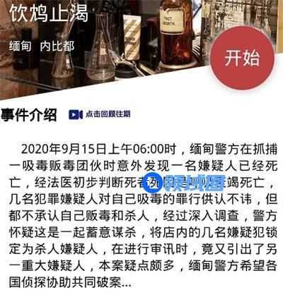 2020年9月15日上午06:00时,缅甸警方在抓捕贩毒团伙时意外发现一名嫌疑人已经死亡,经法医初步判断死者死因是唿吸衰竭死亡,几名犯罪嫌疑人对自己的罪行供认不讳,但都不承认自己贩毒和杀人,经过深入调查,警方怀疑这是一起蓄意谋杀,将店内的几名嫌疑犯锁定为杀人嫌疑人,在进行审讯时,竟又引出了另一重大嫌疑人,本案疑点颇多,缅甸警方希望各国侦探协助共同破案…
