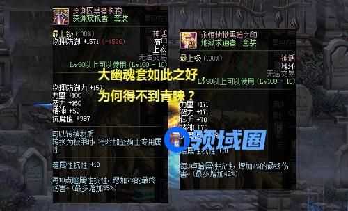 而大幽魂套可能是个例外,套装属性和单件属性都非常的出色,唯一的不足点就在于,搭配起来很费劲,没有个几年半载的根本就凑不齐一套,所以这也足以成为致命缺陷了。
