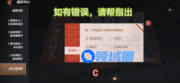 CF手游99公益答题活动第四道题目是:下列应放入绿色垃圾桶是?选项有:A、用过的纸巾,B、帽子,C、榴莲壳,D、塑料文具,那么CF手游下列应放入绿色垃圾桶是什么?下面和游戏宝小编一起去了解一下吧。