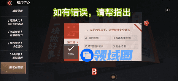 CF手游99公益答题活动第三道题目是:过期药品属于,需要特殊安全处理?选项有:A、其他垃圾,B、有毒有害垃圾,C、不可回收垃圾,D、厨余垃圾,那么CF手游过期药品属于什么垃圾?下面和游戏宝小编一起去了解一下吧。