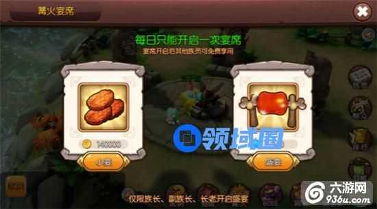 篝火宴席是在家族2级时开启,每天只可以开启一次,族长、副族长、长老均可以开启,玩家们可以选择开启大宴或小宴,开启大宴会获得50点体力与30点精力,小宴会获得30点体力与15点精力。
