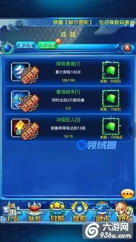 成就在游戏中代表实力的象征,成就越多则代表实力越强,新手初期可以不用可以去追求成就,一般会送上不少成就,然后记得在成就界面领取奖励,一个成就可以领10~100钻石的奖励,聚沙成塔这些钻石奖励可别忽略了,在等级相对稳定的时候,可以参考成就界面那些成就需要做什么,然后扫一遍大概知道那些东西可以很快获得成就,如击杀10红莲骑士兽等成就,则可以每天盯紧boss,联系10天打boss就可以获得这个成就啦。另外有一些需要组合技能的成就,数码宝贝就不要乱进阶了,确定没有可以做的成就在拿去进阶。