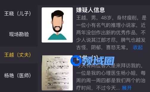 王越,男,48岁,身材瘦削,是一位小有名气的推理小说家,近两年没创作出新的优秀作品,不少人说其江郎才尽,脾气也越发古怪,阴郁,喜怒无常。
