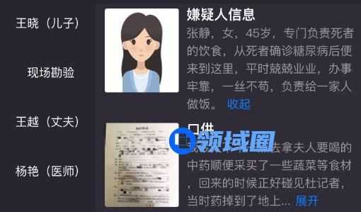 张静,女,45岁,专门负责死者的饮食,从死者确诊糖尿病后便来到这里,平时兢兢业业,办事牢靠,—丝不苟,负责给一家人做饭。