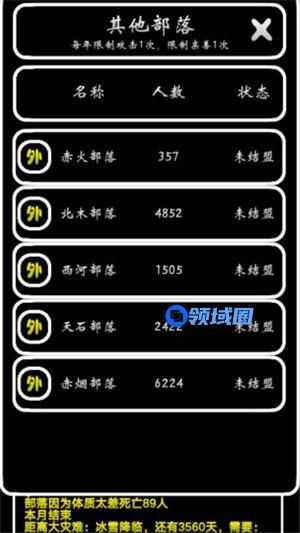 与异族进行外交,可以让我们的部落从异族那里获得资源,或者发动战争。如果选择与异族进贡,则可以增加和异族的友好程度,从而发生贸易。每次进贡,我方将损失掉100人口,并提高和异族10点的友好度。