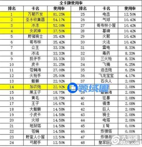 连弩削弱后基本没人用了,顶峰很少见人海战术,因此炸弹塔也没人用了,目前A6-A7很多迫击炮流,网上也有很多文章吹能上3000,但实际统计极少使用,也许已经被破解了吧(小编目前的牌组就是克死迫击炮的)。