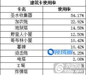水瓶是使用率最高的建筑卡,小编另外有统计了一下,这48个样本中,在没有使用水瓶的情况下,卡组平均耗水3.82,而使用了水瓶的卡组,平均耗水 上升到4.09,意味着可以多使用一张2-3费的卡牌,战斗时间拖得越长越有利。(实践证明,单独对水瓶使用火球、雷电、火箭等都是不划算的,尤其是水瓶 的等级高了之后,因此大家都用水瓶会变成一个常态,除非你玩的是速攻。)