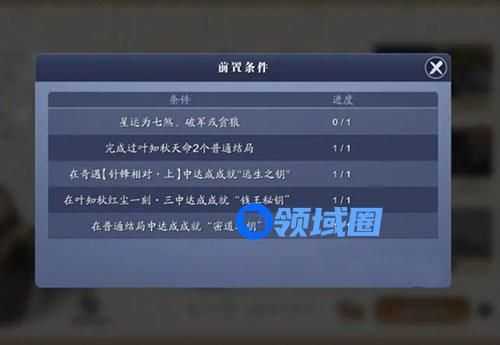 1.星运为七煞、破军或贪狼;2.完成叶知秋天命2个普通结局;3.在奇遇【争锋相对-上】中达成成就“逃生之钥”;4.在叶知秋红尘一刻-三中达成成就“钱王秘钥”;5.在普通解决中达成成就“密道之钥”。