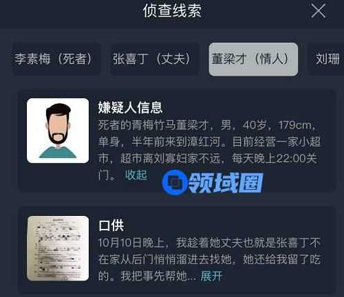 死者的青梅竹马董梁才,男,40岁,179cm,单身,半年前来到漳红河。目前经营一家小超市,超市离刘寡妇家不远,每天晚上22:00关门。