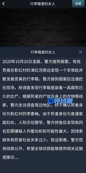 犯罪大师最近又更新了一个新案件“行李箱的女人”,很多玩家不知道这个案件的凶手是谁,今天小编就为大家带来犯罪大师行李箱里的女人答案分析,希望能够帮助到玩家!