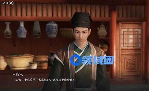 在一个头上有金色的千纸鹤的商人这里,然后与之对话,就可以顺利的得到礼物,这个礼物就是剪纸,叫做子辰剪纸。
