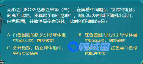无形之门BOSS慈悲之维塔(白),在屏幕中间喊话“如果你们此刻离开此地,我就赐予你们慈悲”。随后队友的脚下随机出现红、白色圆圈,并掉落高伤害球体,此时的正确做法是?这是10月16日DNF智慧星题目之一,回答正确后会有智慧星奖励,那么正确答案是什么呢?下面和游戏宝小编一起去了解一下吧。