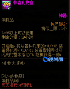 惊喜礼物盒开启后,将从各种几率的+11/+12装备强化券,+10/+11装备增幅券以及闪亮的雷米援助中,随机获得一种。
