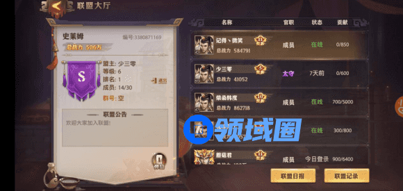 简单来说就是联盟排行榜,盟主位居榜首,当然看不惯盟主,也可以花点银子弹劾他,毕竟没有氪金办不到的事,如果有,那就是氪金不够,这里会显示玩家ID、官职、状态和贡献,鄙视链就此诞生,玩法要领:要想人前显贵,必定钱包大开。