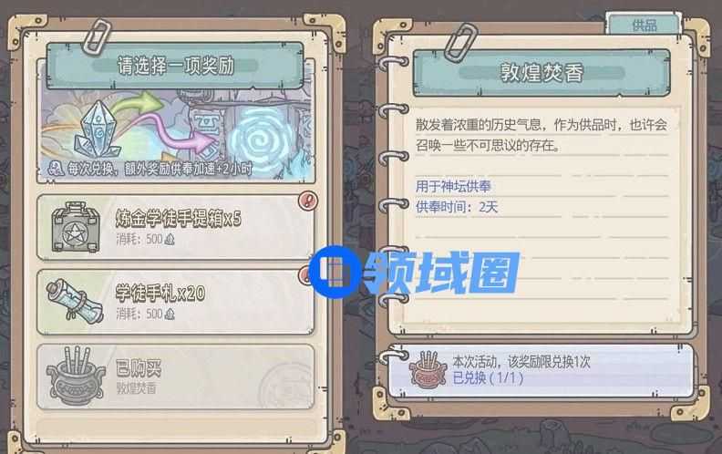 1、在10月9日5:00-10月16日4:59期间换取特殊活动祭品-敦煌焚香。(“水晶大作战”活动第一档奖励,花费500灵能水晶兑换获得)