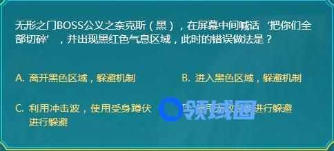 无形之门BOSS公义之奈克斯(黑),在屏幕中间喊话‘把你们全部切碎’,并出现黑红色气息区域,此时的错误做法是?这是10月3日阿拉德智慧星题目,下面游戏宝小编为您带来正确答案。