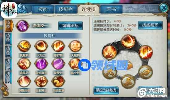 每个玩家可以学习多个技能,但是主界面的每个技能栏只有4个格子,通过【连续技】系统来实现玩家用四个技能栏的位置释放超过4个技能,每个连续技有六个格子,可以将人物技能和法宝技能(XP技不能放入其中)放入其中,格子的数字对应释放的顺序,同一个技能可以多次放入其中。