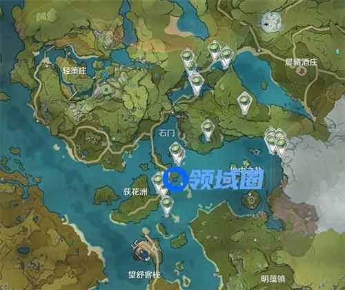 首先就是河流这里,也就是荻花州这里,玩家可以在这个附近的河流旁边,采集这个莲蓬。就是玩家的初始主城蒙德城的南边。