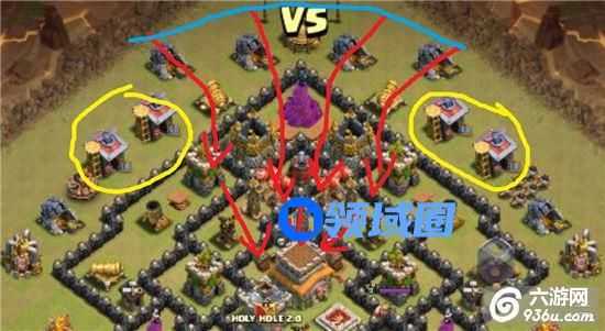 由于王和城堡的位置都在大本下方,如果小编方从上面进攻的话对方援兵的走位应该向上走,那么只要如下图所示做好黄圈内的节点,再从上方蓝线处放一 排龙进攻就能保证龙流大部队会被地方援军和国王引导直接进中爆大本以及最下面那个防空,顺便还能摧毁那个脸朝下方的空气炮,只要狂暴和治疗释放顺利的话三星是妥妥的。