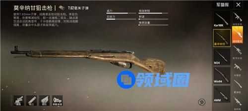 莫辛纳甘狙击枪是一把经典的栓动狙击枪,可以配备高倍镜,还有出路弹匣之外的狙击枪配件。注意,莫辛纳甘可装配的枪托跟98K一样,子弹袋和托腮板均可选择,有着非常多的配件搭配方案可供选择。