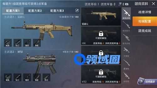 最后就能自由搭配两把主武器的配置方案,解锁新的枪械,需要满足团竞等级条件,并且消耗对应数量的团竞军备。里面的配件也是可以自由搭配的,并且不需要消耗团竞军备。