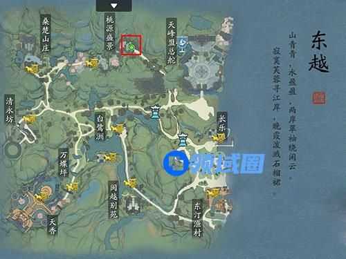满足了以上的条件之后,然后由想要成为徒弟的角色,来邀请准师父进入队伍,之后在来到东越如图所示的位置,就是桃源盛景这里,可以找到莫古轩。