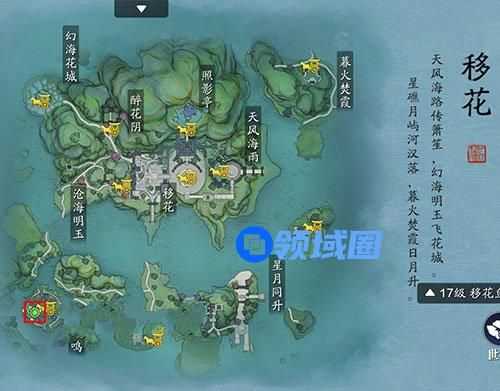 这个传音蛊的位置,就是在移花的左下角,就是霞光流鸣这个地方,玩家可以来到红框这个区域。