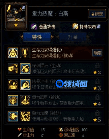 重力恶魔:白斯建议选择辅助前排加点,3星普通攻击选择眩晕有几率造成控制效果,其次4星的护盾效果可以增加自己的存活坦度搭配岩石的减伤就足以造成伤害。